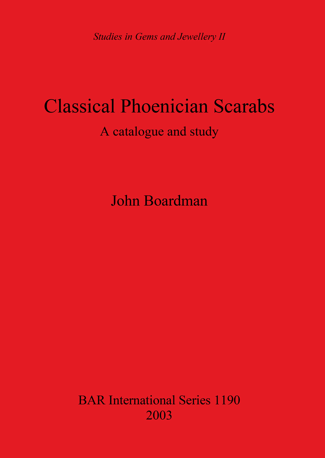 This new series is in the same format as Studies in the History of Collections and Studies in Classical Archaeology. It is intended for studies in gems and jewellery from ancient to neo-classical, both monographs and the publication of contents of collections, and is inspired by the Beazley Archive’s rich resources of gem impressions and casts, gathered first by Sir John Beazley himself. This second volume, Classical Phoenician Scarabs A catalogue and study, is the result of some years of collecting records of the green jasper scarabs of the Mediterranean world in the course of research on other glyptic, Greek and Persian. The principal aim is to present the material in catalogue form, arranged by subject, and accompanied by selective illustration. (The first volume (2003), Classical and Eastern Intaglios, Rings and Cameos, by C. Wagner and J. Boardman, publishes a selection of gems from a private collection formed between 1921 and about 1970. They range from 3rd-millennium BC cylinder seals of Mesopotamia, to Neo-classical engravings of the 19th century AD, and include prime specimens also of Greek, Etruscan, Roman and Sasanian glyptic.